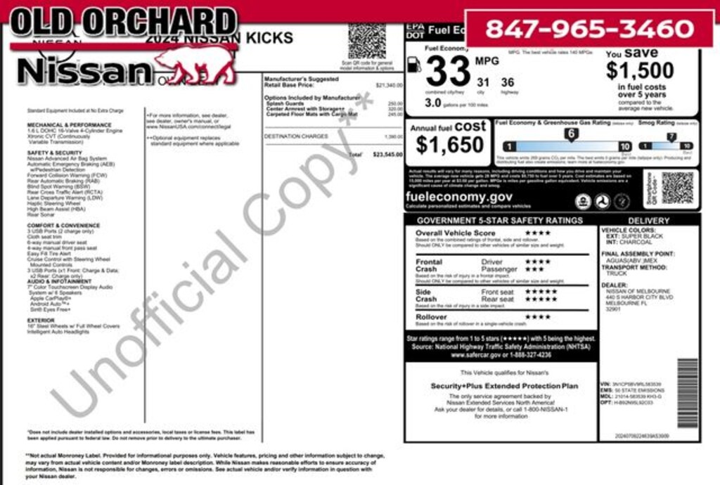 2024 Nissan Kicks CVT with Xtronic Apple CarPlay/Android Auto, Blind Spot Warning, Rear Parking Sensors. Clean CARFAX. CARFAX One-Owner. 31/36 City/Highway MPG 1.6L 4-Cylinder DOHC 16V Odometer is 2349 miles below market average!