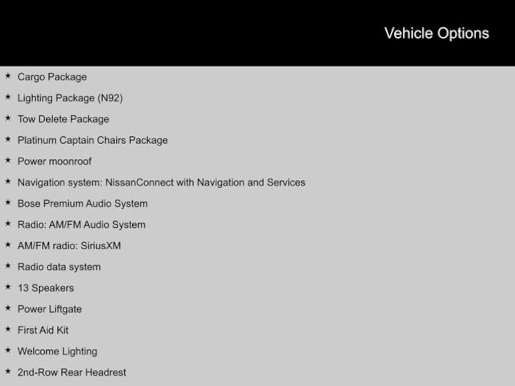 2024 Nissan Pathfinder 13 Speakers, 2nd-Row Captain Chairs, 2nd-Row Rear Headrest, AM/FM radio: SiriusXM, Bose Premium Audio System, Cargo Area Protector, Cargo Net, Cargo Package, Delete Tow Hitch Receiver & Harness, First Aid Kit, Illuminated Kick Plate, Lighting Package (N92), Navigation system: NissanConnect with Navigation and Services, NissanConnect w/Navigation & Services, Platinum Captain Chairs Package, Power Liftgate, Power moonroof, Radio data system, Radio: AM/FM Audio System, Tow Delete Package, Welcome Lighting. CARFAX One-Owner.