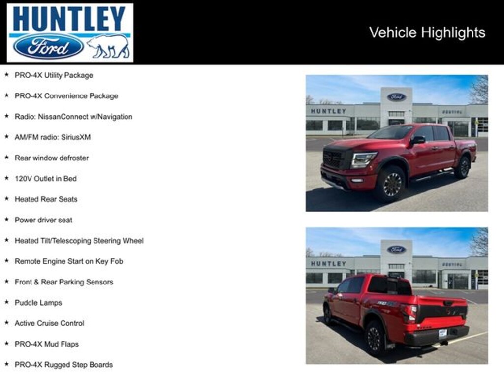 2024 Nissan Titan 4WD, 120V Outlet in Bed, 4-Way Power Assist Seat, Active Cruise Control, AM/FM radio: SiriusXM, Driver Power Folding Auto Dimming Outside Mirrors, Front & Rear Parking Sensors, Heated Driver & Passenger Seat, Heated Rear Seats, Heated Tilt/Telescoping Steering Wheel, Intelligent Around View Monitor (I-AVM), Leather Seat Trim, LED Tailgate Area Illumination, LED Under Rail Bed Lighting, Memory Driver Seat w/Auto Entry/Exit Feature, Power door mirrors, Power driver seat, PRO-4X Badged Floor Mats, PRO-4X Convenience Package, PRO-4X Illuminated Kick Plate, PRO-4X Mud Flaps, PRO-4X Rugged Step Boards, PRO-4X Utility Package, Proximity Activation, Puddle Lamps, Radio: NissanConnect w/Navigation, Rear Underseat Storage, Rear window defroster, Remote Engine Start on Key Fob, Side Turn Signal Lamps on Mirror Housing, Trailer Light Check Function On Key Fob, Utilitrack System w/2 Tie-Down Cleats, Wheels: 18" x 8" Painted Dark Finish Alloy. Clean CARFAX. CARFAX One-Owner.