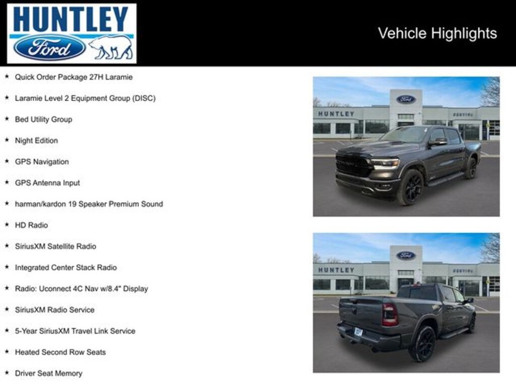2021 Ram 1500 #1 Seat Foam Cushion, 1-Yr SiriusXM Guardian Trial, 3 Rear Seat Head Restraints, 4 Way Front Headrests, 4G LTE Wi-Fi Hot Spot, 5-Year SiriusXM Traffic Service, 5-Year SiriusXM Travel Link Service, 8.4" Touchscreen Display, Accent Color Premium Power Mirrors, Apple CarPlay, Auto Dimming Exterior Passenger Mirror, Auto High Beam Headlamp Control, Bed Utility Group, Black Exterior Truck Badging, Black Headlamp Bezels, Black Interior Accents, Black Painted Exterior Mirrors Caps, Blind Spot & Cross Path Detection, Body Color Door Handles, Body Color Front Bumper, Body Color Rear Bumper w/Step Pads, Bucket Seats, Center Console Parts Module, Disassociated Touchscreen Display, Dome Dual LED Reading Lamp, Driver Seat Memory, Dual Exhaust w/Black Tips, Dual-Pane Panoramic Sunroof, Foam Bottle Insert (Door Trim Panel), For Details, Visit DriveUconnect.com, For More Info, Call 800-643-2112, Front Seat Back Map Pockets, Full Length Upgraded Floor Console, Google Android Auto, GPS Antenna Input, GPS Navigation, Grille Surround 3 Black Texture 2 Black, harman/kardon 19 Speaker Premium Sound, HD Radio, Heated Front Seats, Heated Second Row Seats, Heated Steering Wheel, Integrated Center Stack Radio, Integrated Voice Command w/Bluetooth, Laramie Level 2 Equipment Group (DISC), Leather Trimmed Bucket Seats, LED Dome/Reading Lamp, MOPAR 4 Adjustable Cargo Tie-Down Hooks, Mopar Black Tubular Side Steps, MOPAR Deployable Bed Step, MOPAR Spray In Bedliner, Night Edition, ParkSense Front/Rear Park Assist w/Stop, Pick-Up Box Lighting, Power 4-Way Driver Lumbar Adjust, Power 4-Way Passenger Lumbar Adjust, Power 8-Way Driver & Passenger Seats, Quick Order Package 27H Laramie, Radio: Uconnect 4C Nav w/8.4" Display, Rain Sensitive Windshield Wipers, Rear 60/40 Folding Split Recline Seat, Rear Underseat Compartment Storage, Rear Wheelhouse Liners, Remote Tailgate Release, SiriusXM Radio Service, SiriusXM Satellite Radio, SiriusXM Traffic Plus, SiriusXM Travel Link, Sport Performance Hood, Tailgate Ajar Warning Lamp, USB Host Flip, Ventilated Front Seats.