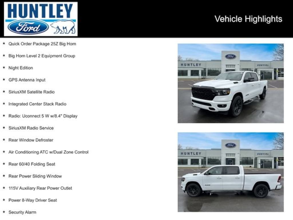 2022 Ram 1500 115V Auxiliary Power Outlet, 115V Auxiliary Rear Power Outlet, 2nd Row In Floor Storage Bins, 3 Rear Seat Head Restraints, 4 Way Front Headrests, 400W Inverter, 4G LTE Wi-Fi Hot Spot, 8.4" Touchscreen Display, Accent Color Premium Power Mirrors, Air Conditioning ATC w/Dual Zone Control, Anti-Spin Differential Rear Axle, Apple CarPlay, Auto-Dimming Exterior Driver Mirror, Auto-Dimming Rear-View Mirror, Big Horn Badge, Big Horn Level 2 Equipment Group, Black Exterior Mirrors, Black Exterior Truck Badging, Black Headlamp Bezels, Black Interior Accents, Black Painted Exterior Mirrors Caps, Black Premium Power Mirrors, Bluetooth Handsfree Phone & Audio, Body Color Front Bumper, Body Color Rear Bumper w/Step Pads, Bucket Seats, Class IV Receiver Hitch, Cluster 7.0" TFT Color Display, Connectivity - US/Canada, Convex Wide-Angle Mirror Insert, Delete LED Lamp - Floor Console Bin, Deluxe Cloth Bucket Seats, Dual Exhaust w/Black Tips, Exterior Mirrors Courtesy Lamps, Exterior Mirrors w/Heating Element, Exterior Mirrors w/Supplemental Signals, For Details, Visit DriveUconnect.com, Front Seat Back Map Pockets, Full Length Floor Console, Global Telematics Box Module (TBM), Glove Box Lamp, Google Android Auto, GPS Antenna Input, Heated Front Seats, Heated Steering Wheel, Integrated Center Stack Radio, Manual Adjust 4-Way Front Passenger Seat, Media Hub w/2 Charge Only USBs, Night Edition, Night Edition (DISC), ParkSense Front/Rear Park Assist w/Stop, Power 2-Way Driver Lumbar Adjust, Power 8-Way Driver Seat, Power Adjustable Pedals, Power-Folding Mirrors, Quick Order Package 25Z Big Horn, Radio: Uconnect 5 W w/8.4" Display, Rear 60/40 Folding Seat, Rear Center Armrest, Rear Dome w/On/Off Switch Lamp, Rear Power Sliding Window, Rear Window Defroster, Remote Start System, Security Alarm, SiriusXM Radio Service, SiriusXM Satellite Radio, Sun Visors w/Illuminated Vanity Mirrors, Universal Garage Door Opener, USB Host Flip, Wheels: 20" x 9.0" Premium Paint/Polished. Clean CARFAX. CARFAX One-Owner.