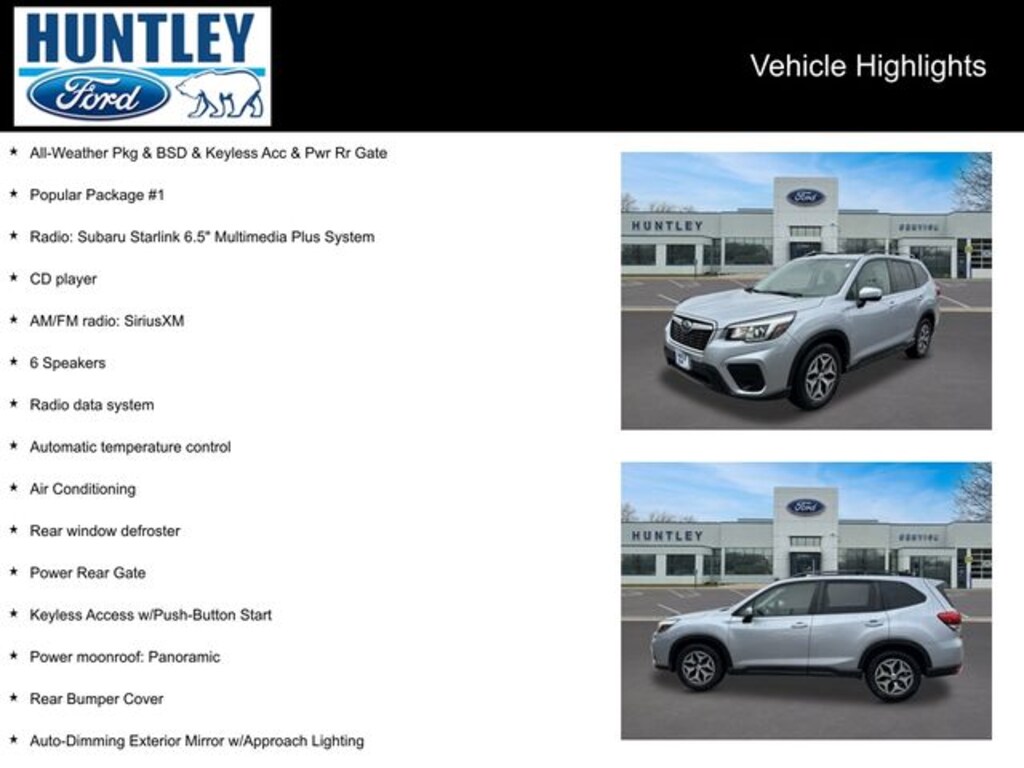 2019 Subaru Forester 6 Speakers, Air Conditioning, All-Weather Floor Liners, All-Weather Pkg & BSD & Keyless Acc & Pwr Rr Gate, AM/FM radio: SiriusXM, Auto-Dimming Exterior Mirror w/Approach Lighting, Auto-Dimming Mirror w/Compass & HomeLink, Automatic temperature control, Blind Spot Detection w/Rear Cross Traffic Alert, Cargo Tray, CD player, Heated Exterior Mirrors, Heated Front Seats, Keyless Access w/Push-Button Start, Popular Package #1, Power moonroof: Panoramic, Power Rear Gate, Radio data system, Radio: Subaru Starlink 6.5" Multimedia Plus System, Rear Bumper Cover, Rear window defroster, Windshield Wiper De-Icer. Clean CARFAX. CARFAX One-Owner.