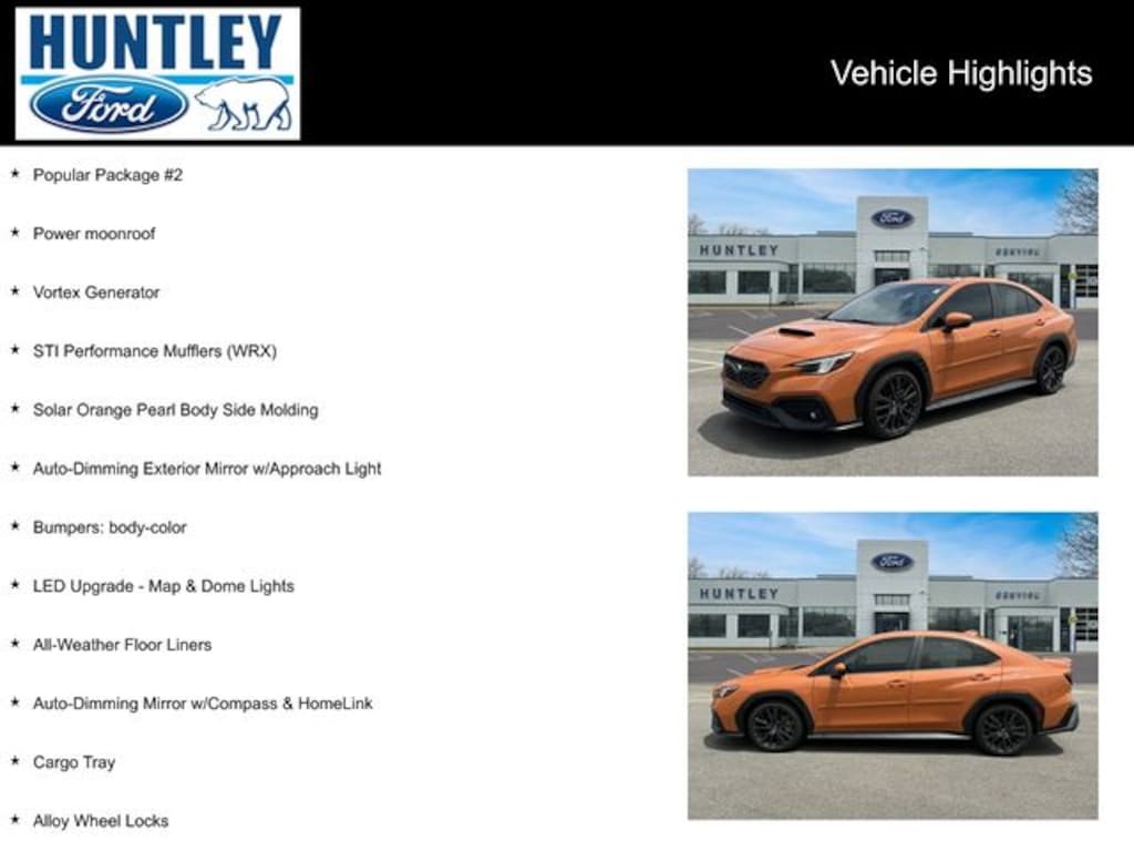 2022 Subaru WRX All-Weather Floor Liners, Alloy Wheel Locks, Auto-Dimming Exterior Mirror w/Approach Light, Auto-Dimming Mirror w/Compass & HomeLink, Bumpers: body-color, Cargo Tray, LED Upgrade - Map & Dome Lights, Popular Package #2, Power moonroof, Solar Orange Pearl Body Side Molding, STI Performance Mufflers (WRX), Vortex Generator. Clean CARFAX. CARFAX One-Owner.