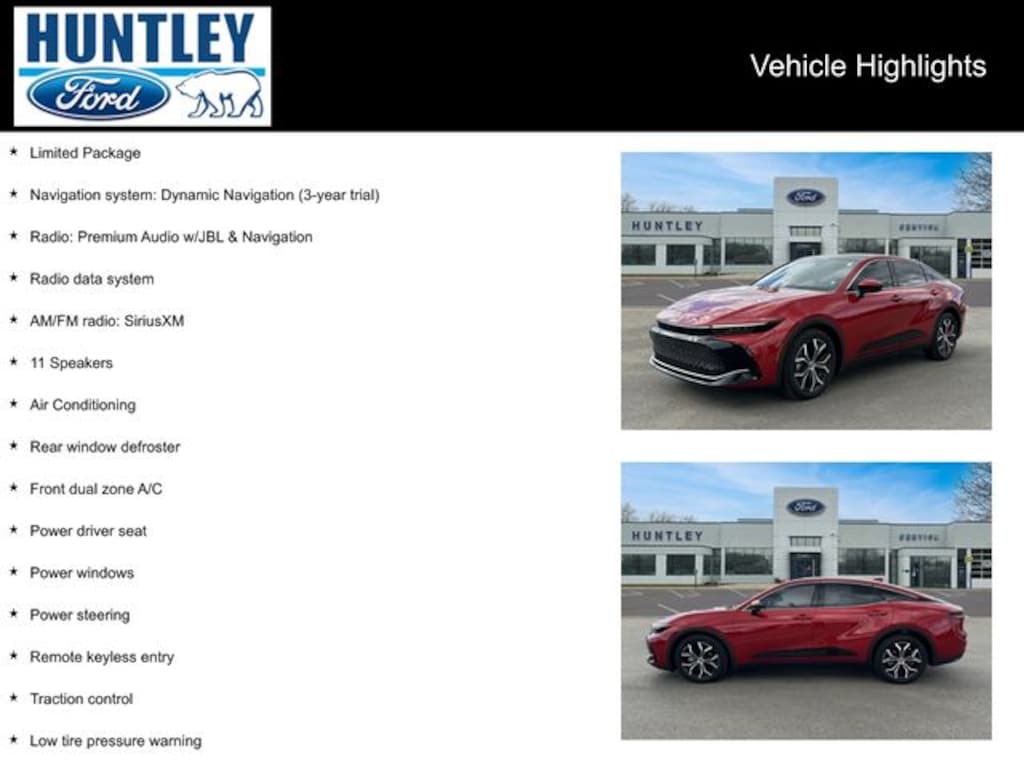 2023 Toyota Crown 11 Speakers, ABS brakes, Active Cruise Control, Air Conditioning, Alloy wheels, AM/FM radio: SiriusXM, Compass, Electronic Stability Control, Front dual zone A/C, Heated door mirrors, Heated front seats, Heated rear seats, Illuminated entry, Leather Seat Trim, LED Headlamps w/Automatic High Beam, Limited Package, Low tire pressure warning, Navigation system: Dynamic Navigation (3-year trial), Panoramic Moonroof, Power driver seat, Power steering, Power windows, Radio data system, Radio: Premium Audio w/JBL & Navigation, Rain sensing wipers, Rear window defroster, Remote keyless entry, Traction control, Variably intermittent wipers, Wheels: 19" x 7" Multi-Spoke Machined 2-Tone Alloy. CARFAX One-Owner.