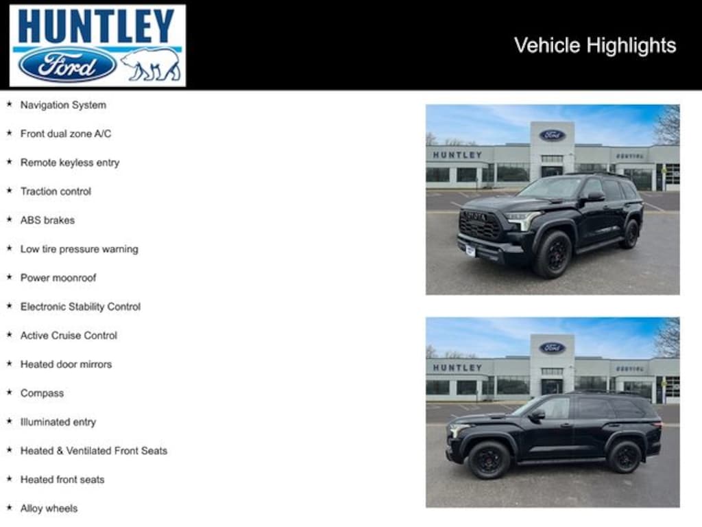 2023 Toyota Sequoia V6 Hybrid, 10-Speed Automatic, 4WD, ABS brakes, Active Cruise Control, Alloy wheels, Compass, Electronic Stability Control, Front dual zone A/C, Heated & Ventilated Front Seats, Heated door mirrors, Heated front seats, Illuminated entry, Low tire pressure warning, Navigation System, Power moonroof, Remote keyless entry, Traction control.