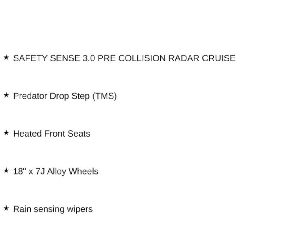 - Forward collision: Toyota Safety Sense (TSS) 3.0 mitigation